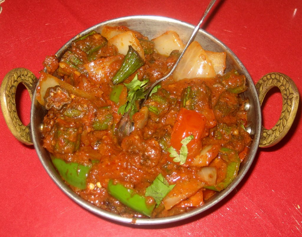 Okra tossed with cooked onion & mildly spiced onion tomato gravy.